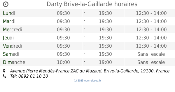 Please note that the information for Darty Dans Brive-la-Gaillarde, Avenue Pierre Mendès-France ZAC du Mazaud and all other Stores is for reference only.
